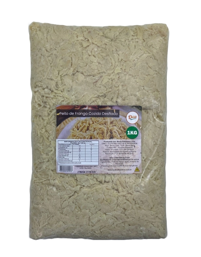 Peito de frango 100% natural, já cozido e desfiado, pronto para uso! Embalado em porção de 1kg, o frango desfiado da Quali Alimentos é a solução prática e saborosa para o dia a dia da sua cozinha. Ideal para recheios, saladas, massas, tortas, sanduíches e muito mais. Produto congelado, sem adição de conservantes, com rendimento e qualidade garantidos para facilitar a rotina e padronizar suas receitas.