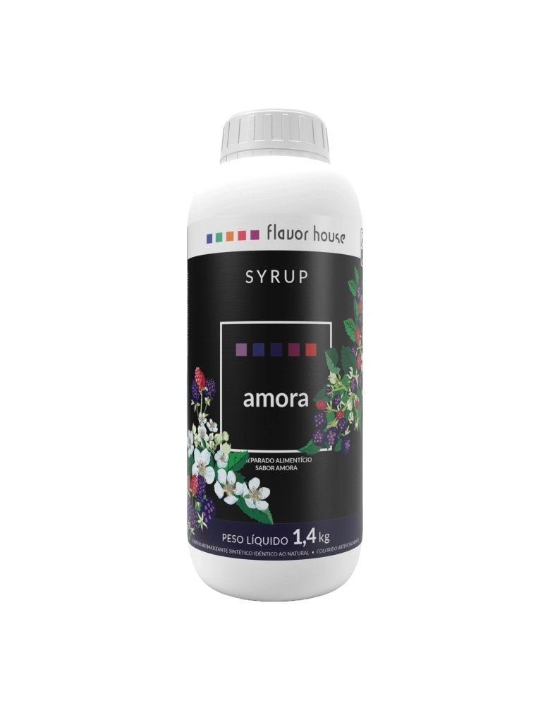 Ingredientes: Açúcar líquido invertido, água, suco concentrado de amora, regulador de acidez ácido malico (INS 296), aroma idêntico ao natural de amora, edulcorante sucralose (INS 955) e corante artificial azul brilhante FCF (INS 133).